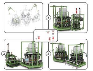 New generation blowing system – combining press/blow and blow/blow features as well as rotation and static blowing; providing the platform to scale to 1/1, 1/3, 1/6, 2/12, 6/12, 6/18, 2/20 blowing technology solutions and fully automated, digitalized and integrated production lines.